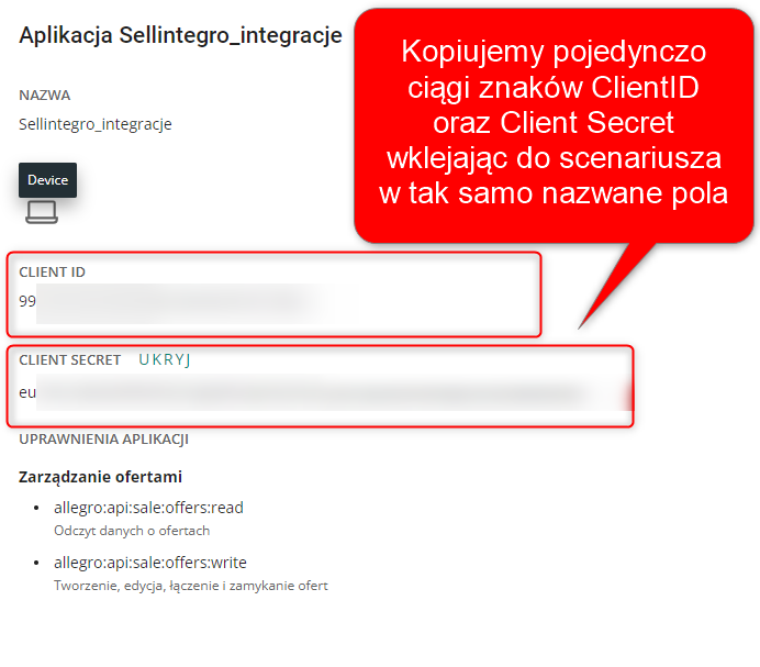 Kopiujemy kolejno CLIENT ID i wklejamy na scenariusz. Tak samo dla CLIENT SERWER.